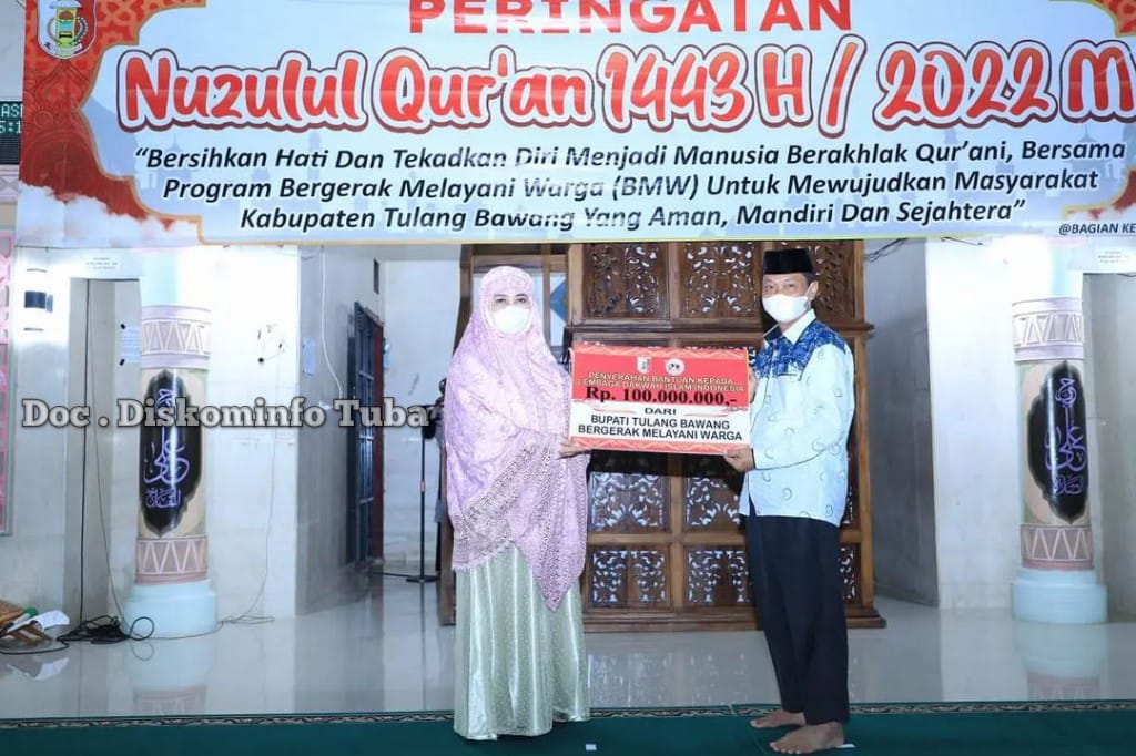 TULANG BAWANG-Bupati Tulang Bawang (Tuba) Winarti menggelontorkan dana Rp300 juta, saat menghadiri peringatan Nuzulul Quran 1443 Hijriah, di Masjid Islamic Center Menggala, Rabu (20/04/2022).