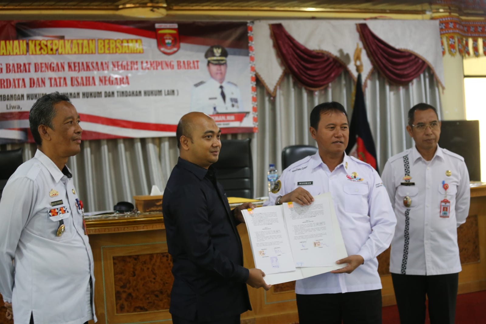 LAMPUNG BARAT – Penjabat (Pj) Bupati Kabupaten Lampung Barat (Lambar) Drs. H. Nukman M.M dan Kepala Kejaksaan Negeri (Kajari) Lambar Deddy Sutendy, SH,. M.H menandatangani kesepakatan bersama tentang penanganan masalah bidang hukum perdata serta Tata Usaha Negara (TUN) di lingkungan Pemerintah Kabupaten (Pemkab) Lambar.