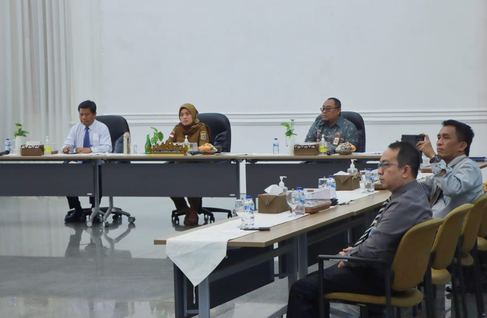Bandar Lampung —- Wakil Gubernur Lampung, Chusnunia, didampingi Kepala OJK Provinsi Lampung dan Kepala Kantor Perwakilan Bank Indonesia (BI) Provinsi Lampung mengikuti Pertemuan Tahunan Industri Jasa Keuangan 2023 secara virtual dari Mahan Agung, Senin (06/02/2023).