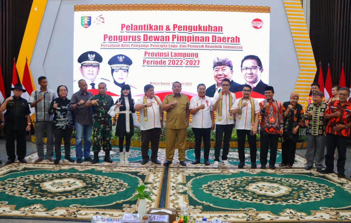 BANDARLAMPUNG—Gubernur Lampung Arinal Djunaidi menghadiri kegiatan Pelantikan dan Pengukuhan Pengurus Dewan Pimpinan Daerah (DPD) Persatuan Artis Penyanyi, Pencipta Lagu, dan Pemusik Republik Indonesia (PAPPRI) Provinsi Lampung Periode 2022 – 2027 di Mahan Agung, Selasa (14/03/2023).