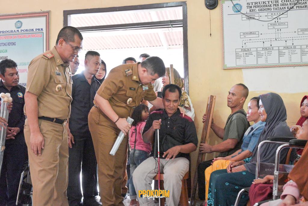 Terpantau, Bupati Pesawaran Dendi Ramadhona bersama Dinas Sosial Provinsi Lampung menyerahkan bantuan untuk 100 orang penyandang disabilitas.