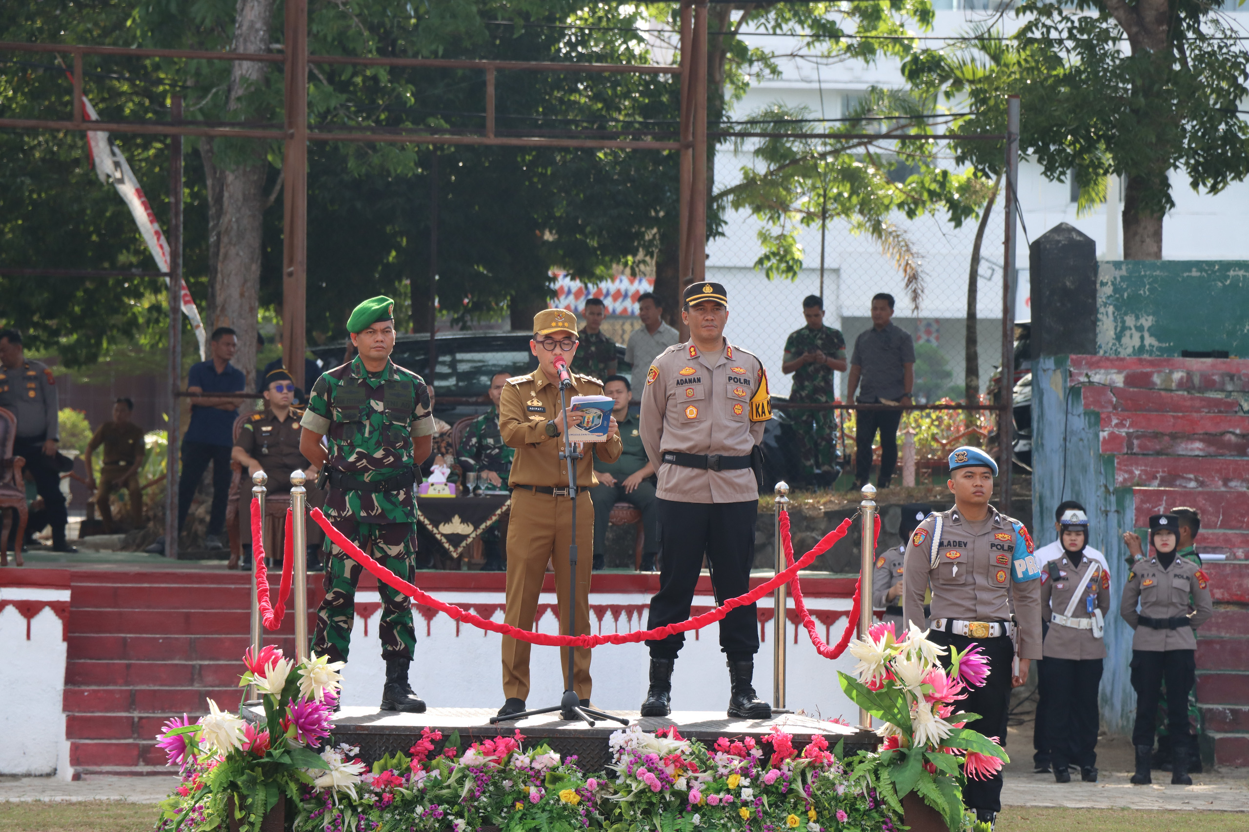 Dengan dihadiri Kapolres Way Kanan AKBP Adanan Mangopang, Dandim 0427/WK Letkol Inf. Aan Fitriadi, Ketua DPRD Kabupaten Way Kanan, Forkompimda, Ketua KPU, Ketua Bawaslu, Pejabat Utama, para Kapolsek, perwira staf, personel TNI, Polres Way Kanan, BPBD, Dishub, Satpol PP dan Linmas serta tamu undangan.