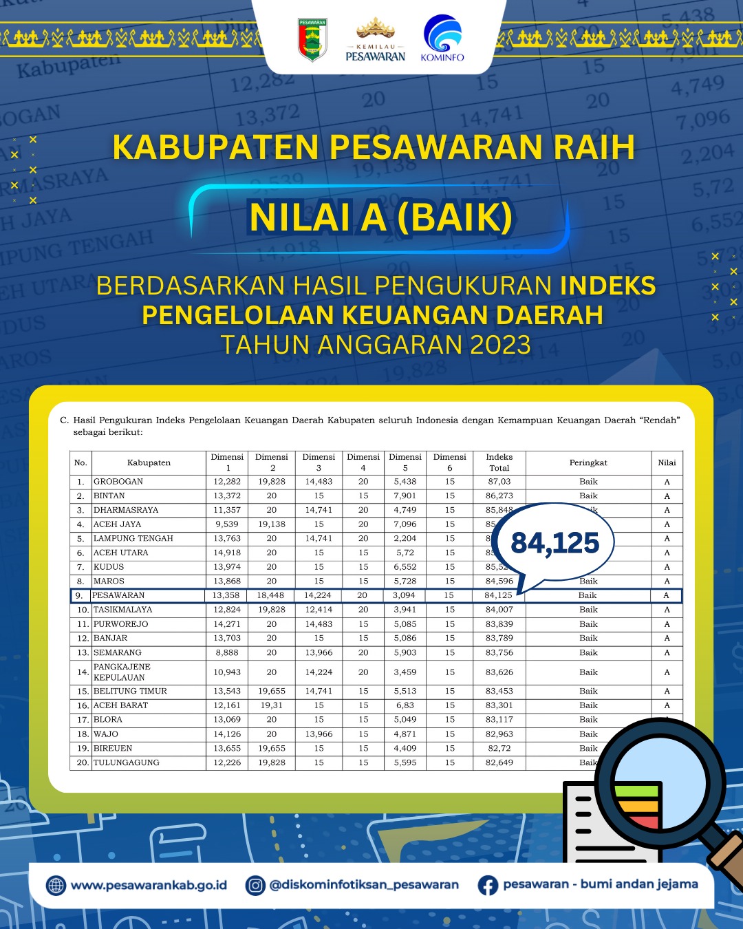 Pemkab Pesawaran berhasil menempati posisi ke-9 dengan indeks total sebesar 84,125 pada hasil pengukuran Indeks Pengelolaan Keuangan Daerah bersama 195 Kabupaten seluruh Indonesia dengan kemampuan keuangan daerah rendah.